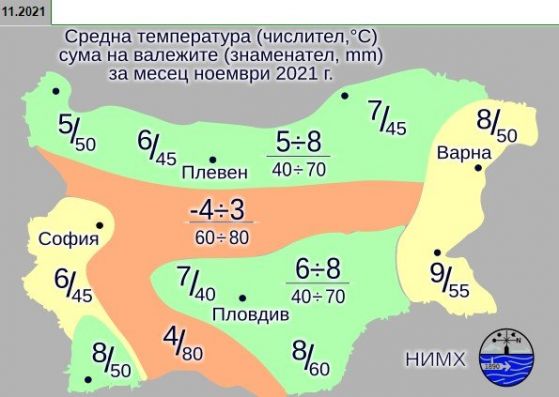 Тази година през ноември се чака междинната месечна температура да бъде към и над нормата, която за Северна България и Горнотракийската равнина е сред 5 и 8°, за високите полета – сред 3 и 5°, по Черноморието и долината на р. Струма – сред 8 и 10°, в планинските региони — от минус 5 до 3°.