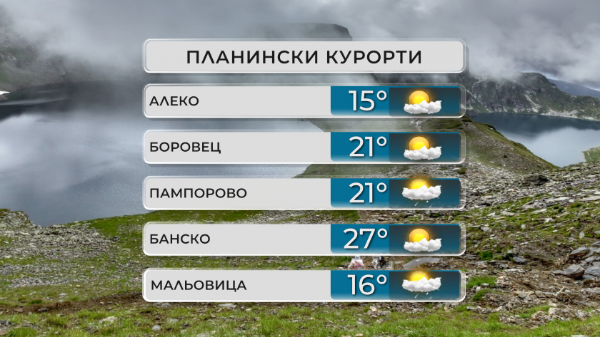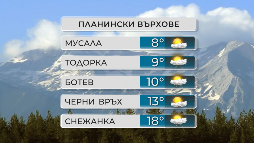 В планините ще доминира слънчево време. В следобедните часове ще се развие купеста облачност и на доста места в масивите от Централна и Източна България ще превали временен дъжд с гръмотевици. Ще духа до сдържан, по билата и краткотрайно мощен североизточен вятър. Максимална температура на височина 1200 метра към 22°, на 2000 метра към 14°.