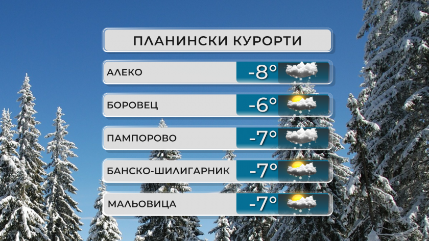 В планините ще бъде най-вече облачно с валежи от сняг. Ще духа мощен север-североизточен вятър и ще има виелици и навявания. Максималната температура на височина 1200 метра ще към минус 4°, на 2000 метра - към минус 10°.