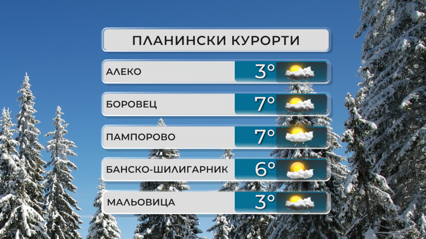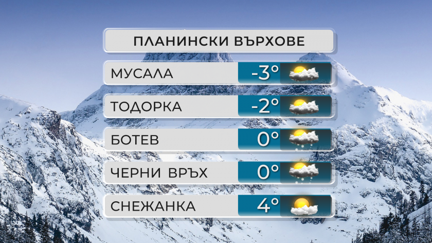 В планините облачността ще е променлива, преди обяд най-вече забележителна. Само на изолирани места ще превали едва. Ще духа мощен до плевел вятър от северозапад. Максимална температура на височина 1200 метра - 8°, на 2000 метра - към 2°.
