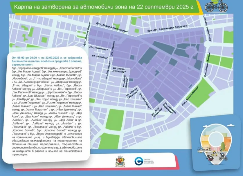 Днес означаваме Деня без коли в границите на Европейската седмица на подвижността. Между 08.00 и 20.00 часа централната част на София ще бъде затворена за придвижване на МПС, оповестиха от Центъра за градска подвижност.