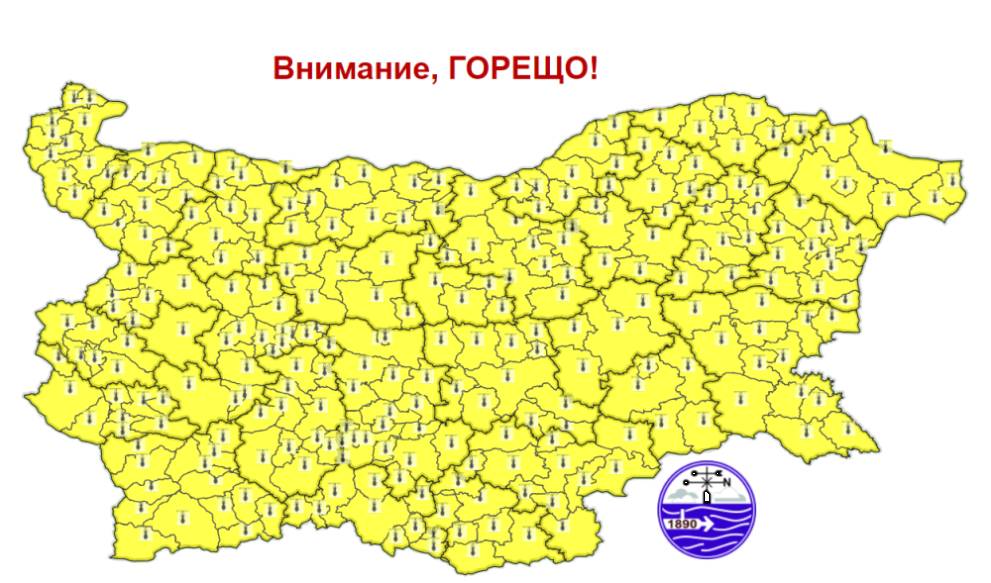 Днес още веднъж ще е слънчево и горещо . Жълт код за опасно горещо време е разгласен в цялата страна. Ще духа слаб до сдържан вятър от север-североизток. Максималните температури ще са сред 34° и 39° , в София – 33°, оповестиха от Национален институт по метеорология и хидрология.
