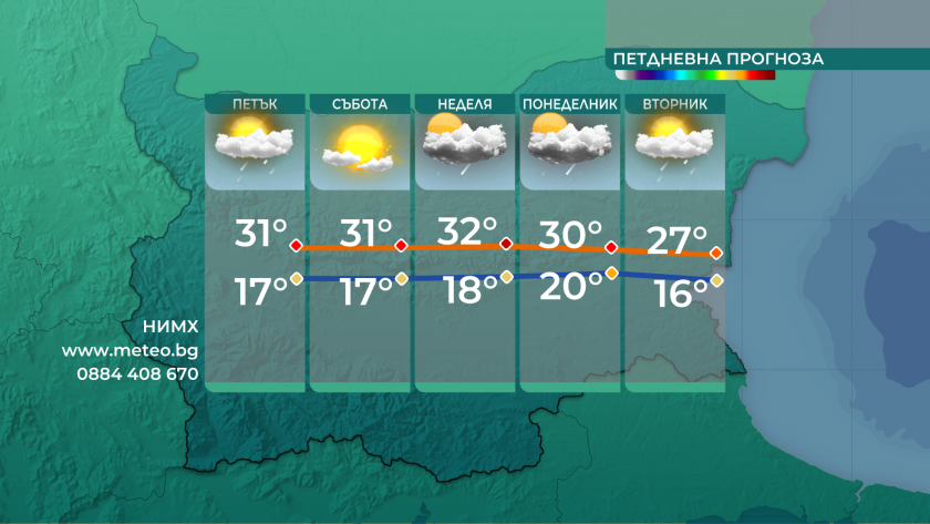 През почивните дни ще бъде най-вече слънчево, след обяд ще се развива купеста и купесто-дъждовна облачност. В събота единствено на обособени места, основно в планинските региони, ще превали и прегърми. Вятърът ще е слаб от изток-североизток. В неделя краткотрайни превалявания, съпроводени с гръмотевици ще има на повече места в страната. Вятърът ще се ориентира от запад-северозапад и ще се усили до сдържан, с него ще се затопли още малко и оптималните температури ще са сред 30° и 35°. В началото на новата седмица в утринните часове ще бъде най-вече слънчево, а в следобедните - с развиване на купеста и купесто-дъждовна облачност. Ще има и краткотрайни превалявания и гръмотевици, на повече места в понеделник.