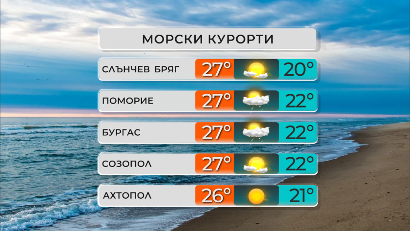 По Черноморието преди обяд ще бъде най-вече слънчево. След обяд основно по северното крайбрежие ще се развива купеста облачност и ще превали. Ще духа до сдържан североизточен вятър. Максималните температури ще са сред 24° и 27°. Температурата на морската вода е сред 20° и 22°. Вълнението на морето ще бъде 1-3 бала.