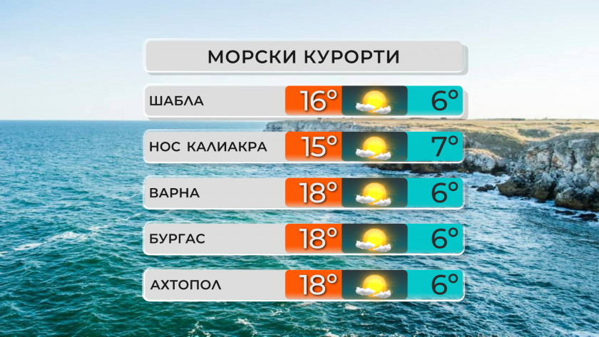 По Черноморието ще е най-вече слънчево, а оптималните температури ще са сред 15° и 18°. Температурата на морската вода е 6°-7°. Вълнението на морето ще бъде 2-3 бала.