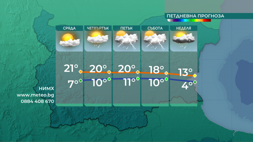 Температурите ще се покачат и преобладаващите оптимални ще са най-вече сред 19° и 24°, по-ниски тук-там по Черноморието, в София към 19°.