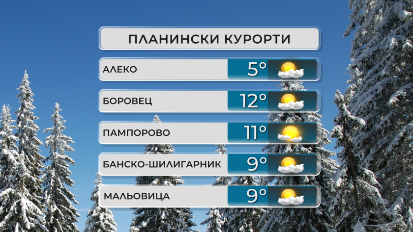 В планините облачността ще е променлива. Ще духа сдържан запад-югозападен вятър. Максималната температура на 1200 метра ще е към 12°, на 2000 метра към 4°.