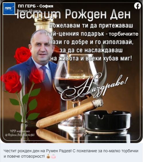 ГЕРБ поздрави Радев за рождения му ден и му пожела по-малко торбички