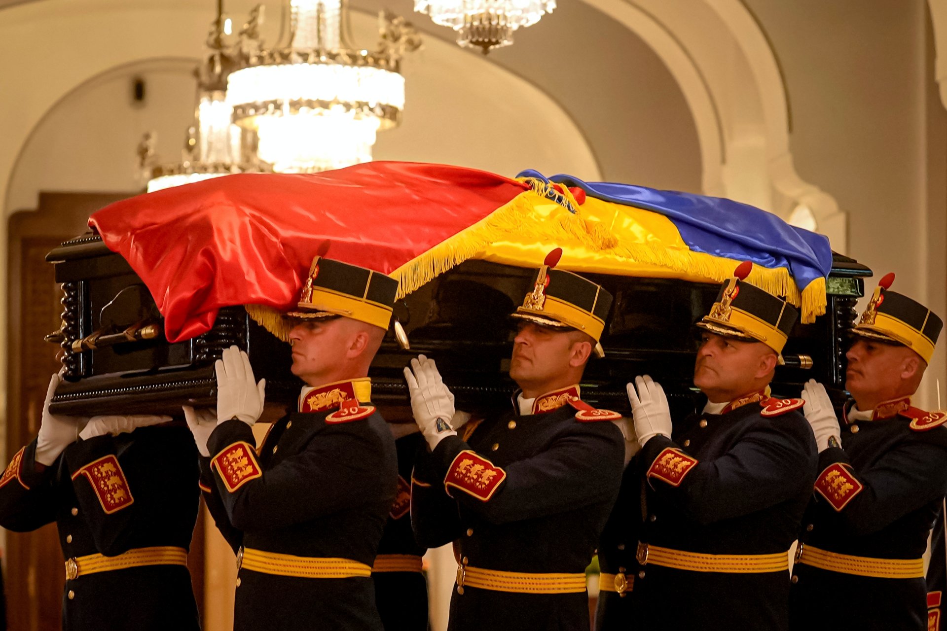 Осем бойци от 30-ти гвардейски полк " Михай Витязу " придвижиха ковчега от входа на двореца до залата под звуците на непрекъснатия камбанен звън на църквата в двора, осведомят румънските медии, представени от Българска телеграфна агенция.