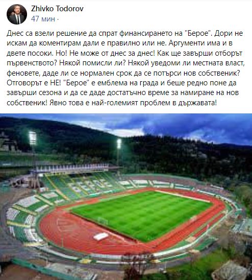 " Днес са взели решение да спрат финансирането на " Берое ". " Берое " е емблема на града и беше редно най-малко да приключи сезона и да се даде задоволително време за намиране на нов притежател! Явно това е най-големият проблем в страната! " това написа яростно във " Facebook кметът на Стара Загора Живко Тодоров. Той е безапелационен, че никой не е уведомил локалната власт за това решение.