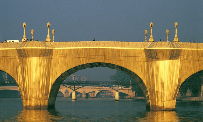 Първата от трите съоръжения, която през актуалната година има празник – „ Опакованият Пон Ньоф “ (The Pont Neuf Wrapped) - е приключена на 22 септември 1985 година след близо 10-годишна работа по плана. „ Пон Ньоф “ в Париж, чието име значи Новия мост, в действителност е най-старият мост във френската столица. За пакетирането на моста преди 4 десетилетия са употребявани 41 800 квадратни метра полиамидна тъкан, наподобяваща на тип на сатен с нюансите на златни пясъци. Платното е завързано с 13-километрово въже и обезопасено от 12,1-тонни стоманени вериги, обкръжаващи всяка една от колоните на моста на един метър под водата на река Сена. Инсталацията може да се види в продължение на 14 дни.
