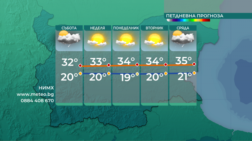 Днес ще бъде най-вече слънчево, само че след обяд и вечерта над западната половина от страната ще се развива купеста облачност и тук-там там ще превали временен дъжд с гръмотевици. Ще духа слаб до сдържан изток-североизточен вятър. Максималните температури ще бъдат сред 30° и 35°, в София - към 29°.