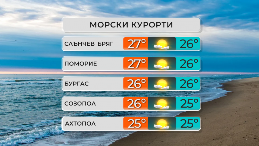 Над Черноморието ще бъде най-вече слънчево, само че в утринните часове тук-там ще има понижена видимост или ниска облачност. Ще духа слаб до сдържан източен вятър. Максималните температури ще са 25°-28°. Температурата на морската вода е 24°-26°. Вълнението на морето ще бъде 1-2 бала.