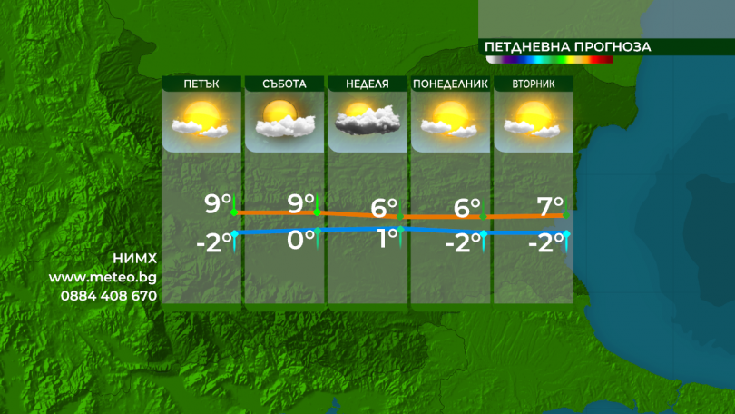 В петък ще се задържи най-вече слънчево и стоплянето ще продължи. В събота облачността ще се усилва и в неделя на обособени места в Източна България ще превали слаб дъжд, в планините - слаб сняг. Дневните температури едва ще се намалят. В началото на идната седмица ще стартира ново стопляне.