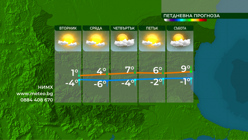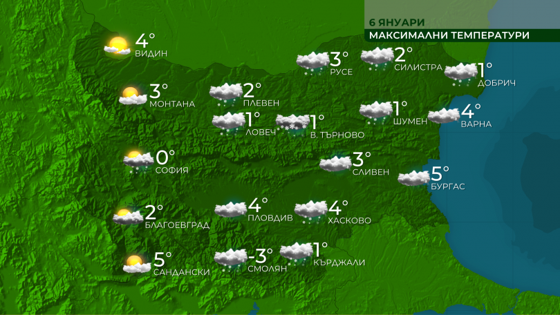 Днес ще е най-вече облачно, в планините и тук-там в източната половина от страната ще превалява сняг. Условия за по-значителни снеговалежи и навявания има в Централния Предбалкан. С сдържан и мощен вятър от север-североизток, ще продължи да става студено. Минимални температури - сред минус 3° и 2°, оптимални най-вече сред минус 1° и 4°.