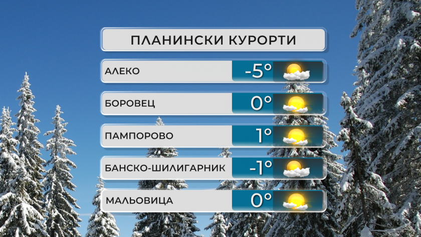 Над планините ще доминира слънчево време, към обяд облачността ще стартира да се усилва. Ще духа сдържан северозападен вятър. Максималната температура на височина 1200 м ще е към 1°, на 2000 м - към минус 6°.