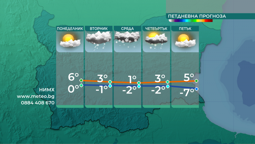 Днес ще е най-вече слънчево. Около обяд от запад облачността ще стартира да се усилва. Северозападният вятър ще отслабне, по здрач ще се ориентира от югозапад, ще е до сдържан. Минималните температури са най-вече сред минус 3° и 2°; оптималните сред 4° и 9°.
