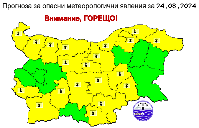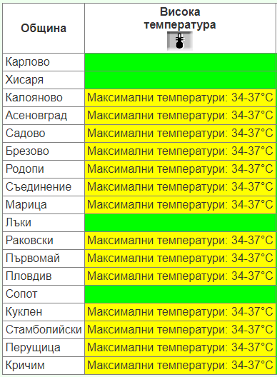 Издадено е предизвестие първа степен за рискови горещини – жълт код. Той е в действие за множеството общини от Област Пловдив: