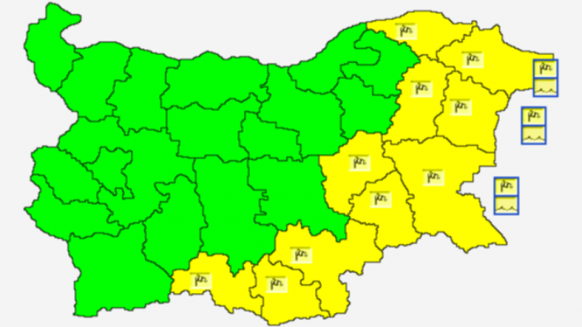 Това са областите: Силистра, Добрич, Шумен, Варна, Сливен, Ямбол, Бургас, Хасково, Кърджали и Смолян. Там вятърът ще е краткотрайно мощен от североизток с пориви до 24 m/s.