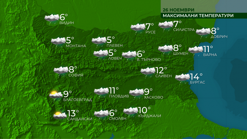 Днес ще продължи да вали, като по-значителни количества се чакат в Южна и Източна България. Ще бъде и прохладно с минимални температури от 3° в Ловеч до 13° в Бургас, в София – към 6° и оптимални - от 5° до 14°. В планините ще вали и дъжд, и сняг, като границата ще е на надморска височина към 1200 м. Вятърът ще е сдържан, от североизток.
