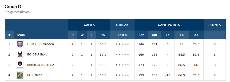 И четирите тима в групата на настоящите първенци на България са с еднакъв баланс от по 1 победа и 1 загуба. Това значи, че възможна победа на Балкан над Бешикташ ще класира българския отбор за Топ 16 на втория по мощ шампионат на ФИБА.