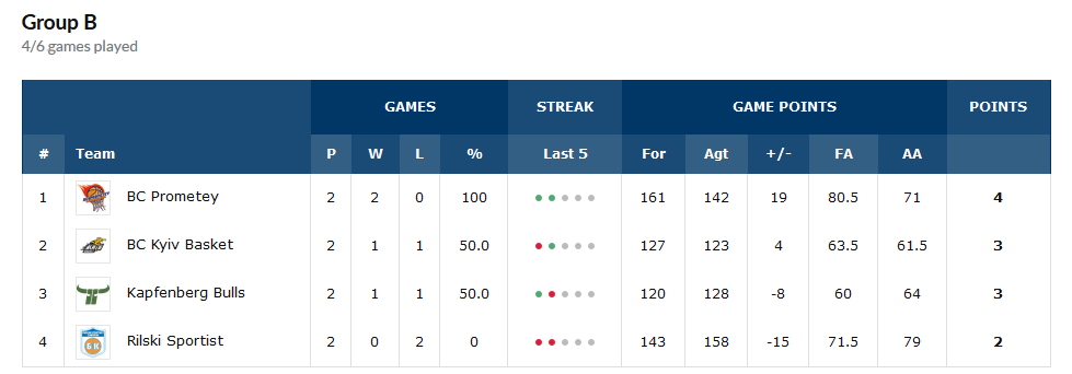 Ако това се случи, Рилски, Капфенберг и Киев Баскет ще са с баланс от по 1-2, само че българският тим ще заеме втората позиция и ще се класира напред поради по-доброто си точково съответствие по отношение на останалите два отбора.