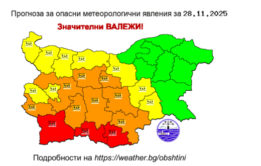 Червен и най-голям код за рисково време и обилни превалявания е в действие за три области: Благоевград, Смолян и Кърджали. Очакваните количества валежи за тези области са от 40-60 mm, в обособени региони и над 80 mm. В по-малка степен – оранжев код е в действие за Габрово, Ловеч, София област, Кюстендил, Пазарджик, Пловдив, Стара Загора и Хасково. Жълт код за евентуално рисково време и по-малко като количество превалявания и в действие за областите: Видин, Монтана, Враца, Плевен, Велико Търново, София град, Перник, Сливен, Ямбол, елементи от Стара Загора и Пловдив. В Източна България кодът е зелен и няма заплаха.