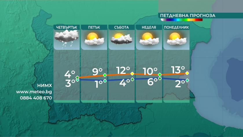 Днес ще се задържи най-вече облачно, тук-там в низините и мъгливо. Преди обяд основно в Централна и Източна България ще има превалявания от дъжд и сняг, след обяд в Централна Южна България ще продължи да превалява дъжд, само че до вечерта и там преваляванията ще спрат. Ще духа до сдържан север-северозападен вятър, в югоизточните региони - от север-североизток и там краткотрайно ще се усилва. Минималните температури са сред 0° и 5°, в София към 0°. Дневните температури ще са без значителен ход и оптималните ще са сред 2° и 7°.