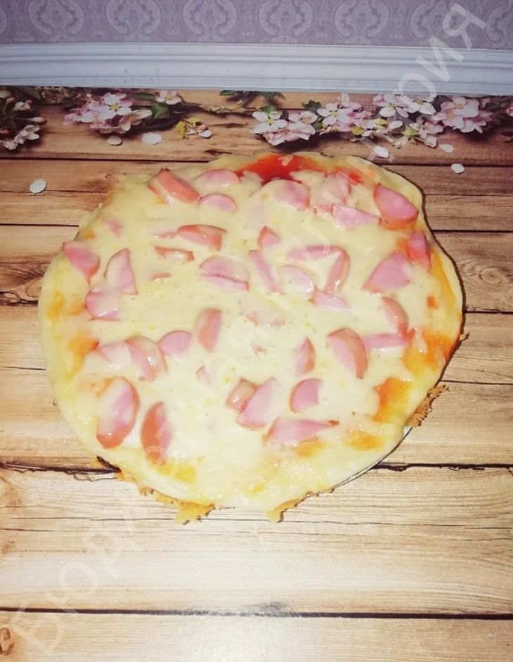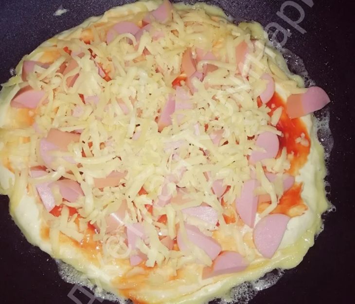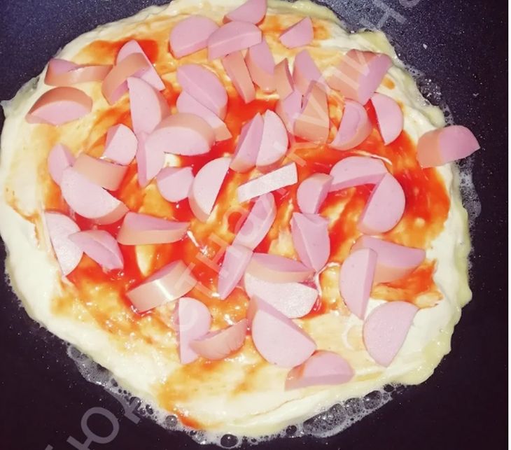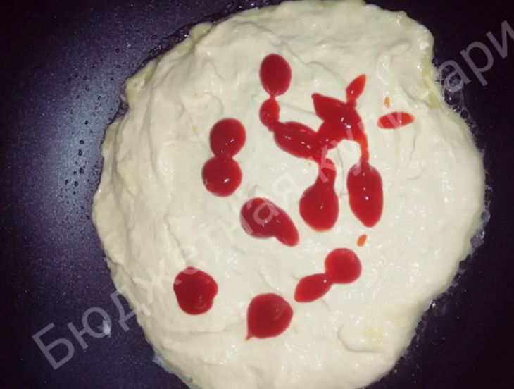 После разнесете тестото в него, а от горната страна сложете кетчупа.