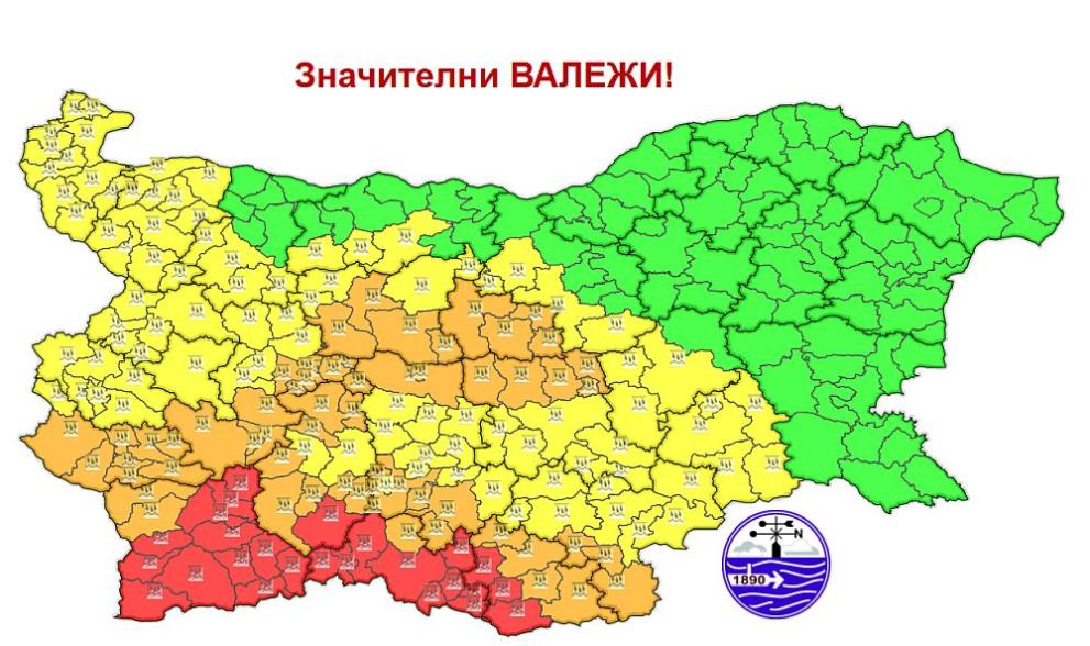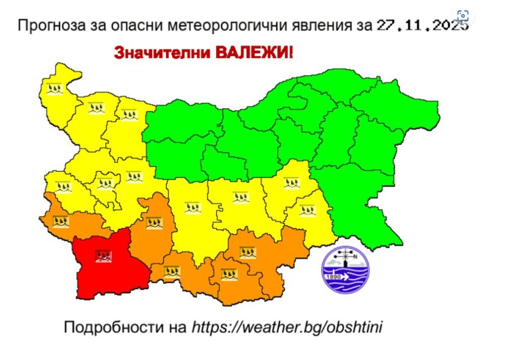 През идващото денонощие ще се задържи облачно. Почти в цялата страна ще вали дъжд. Обилни и продължителни ще са преваляванията в западните, южните и централните елементи от страната. Утре (28 ноември) тук-там и в Източна България ще вали дъжд, съпроводен с гръмотевици. Червен и най-голям код за рисково време и обилни превалявания е в действие за три области: Благоевград, Смолян и Кърджали. В по-малка степен - оранжев код е в действие за Габрово, Ловеч, София област, Кюстендил, Пазарджик, Пловдив, Стара Загора и Хасково. Жълт код за евентуално рисково време и в действие за областите: Видин, Монтана, Враца, Плевен, Велико Търново, София град, Перник, Сливен, Ямбол, елементи от Стара Загора и Пловдив. В Източна България кодът е зелен и няма заплаха.