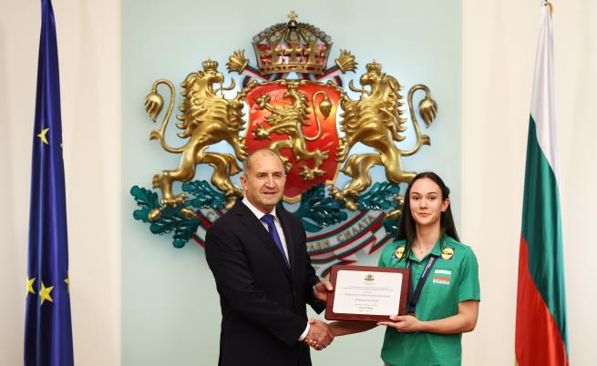 Държавният глава удостои тима с Почетен плакет на президента за изключителни заслуги в развиването на българския спорт и извоюваното преди дни първо място на Световното състезание по волейбол за дами във възрастова група под 19 години.