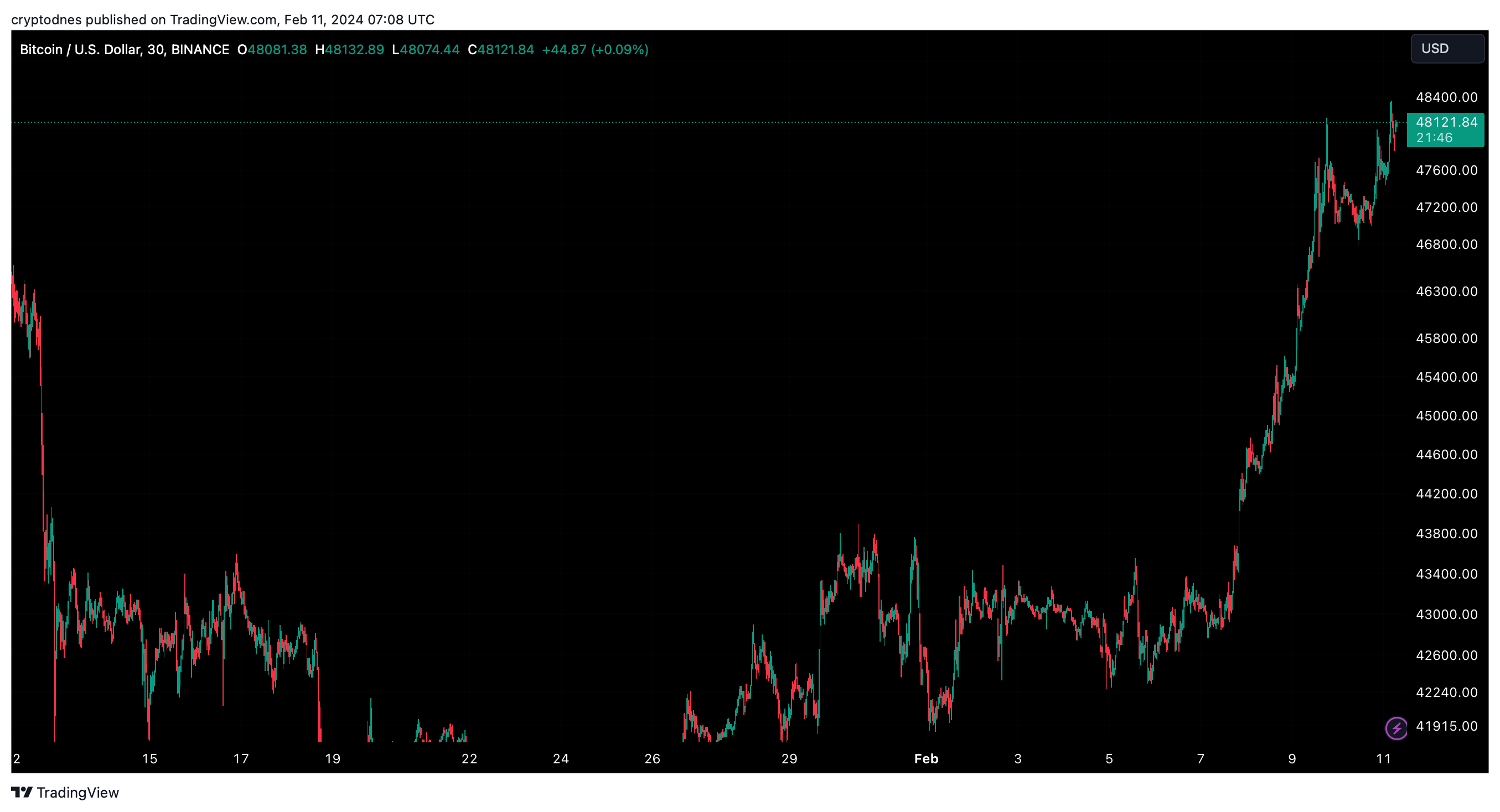 Днес сутринта Биткойн проби над $48,000 и се търгува за към $48,120, отбелязвайки растеж от над 2% в границите на последните 24 часа и малко над 12% за последните 7 дни, достигайки най-високата си оценка от близо месец насам, съгласно данни от TradingView.