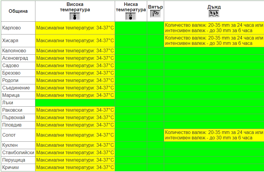За област Пловдив са издадени предупредителни кодове за рискови горещини, а за три общини - и за интензивни превалявания: