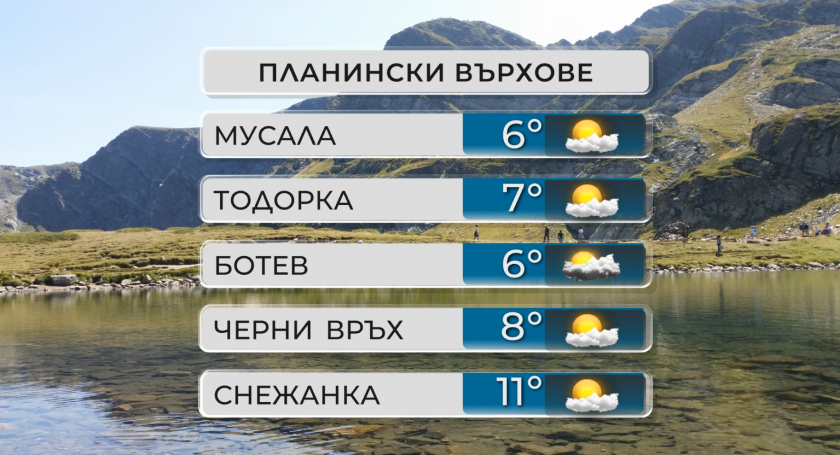 В планините ще доминира слънчево време, с мъгли по билата и върховете до обяд и купеста облачност в следобедните часове. Само на изолирани места за малко ще превали. Ще духа до сдържан вятър от изток-североизток, по най-високите елементи - от запад.