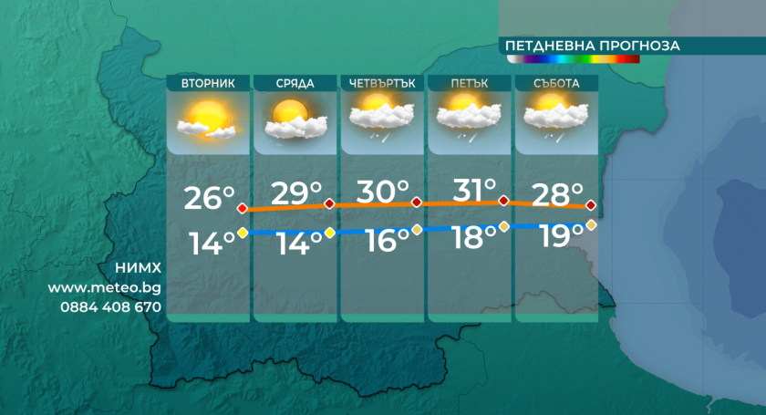 Днес в по-голямата част от страната ще е най-вече слънчево, с купеста облачност в следобедните часове, като превалявания са малко евентуални. Ще духа слаб до сдържан изток-североизточен вятър, оповестява Българска национална телевизия.
