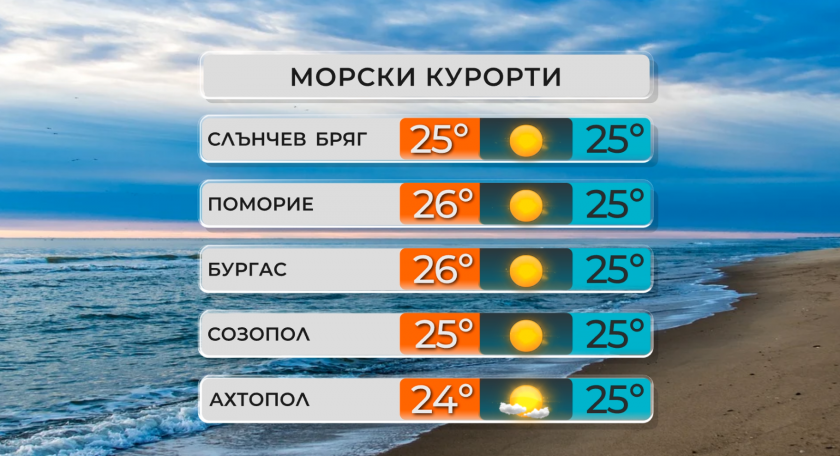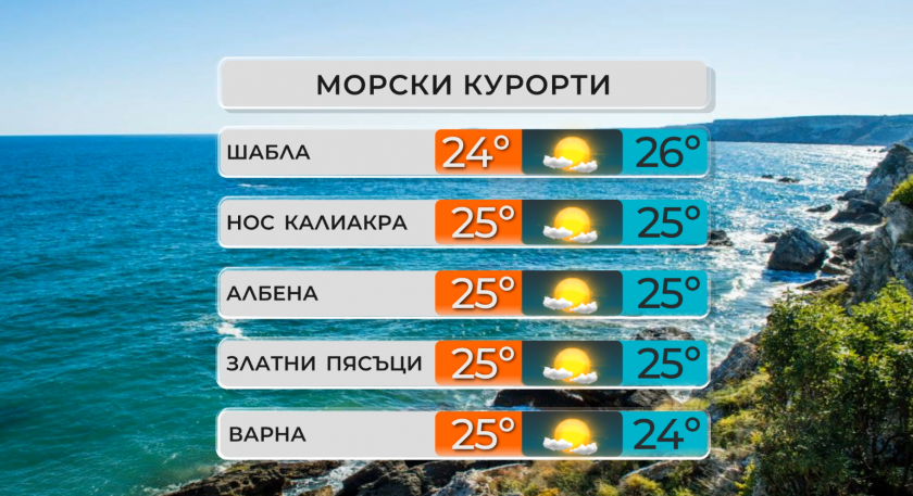 По Черноморието ще бъде слънчево. Ще духа до сдържан вятър от север-североизток. Максималните температури ще бъдат сред 24° и 27°. Температурата на морската вода е от 24° до 26°. Вълнението на морето в множеството региони ще е към 3 бала, с наклонност да отслабва.