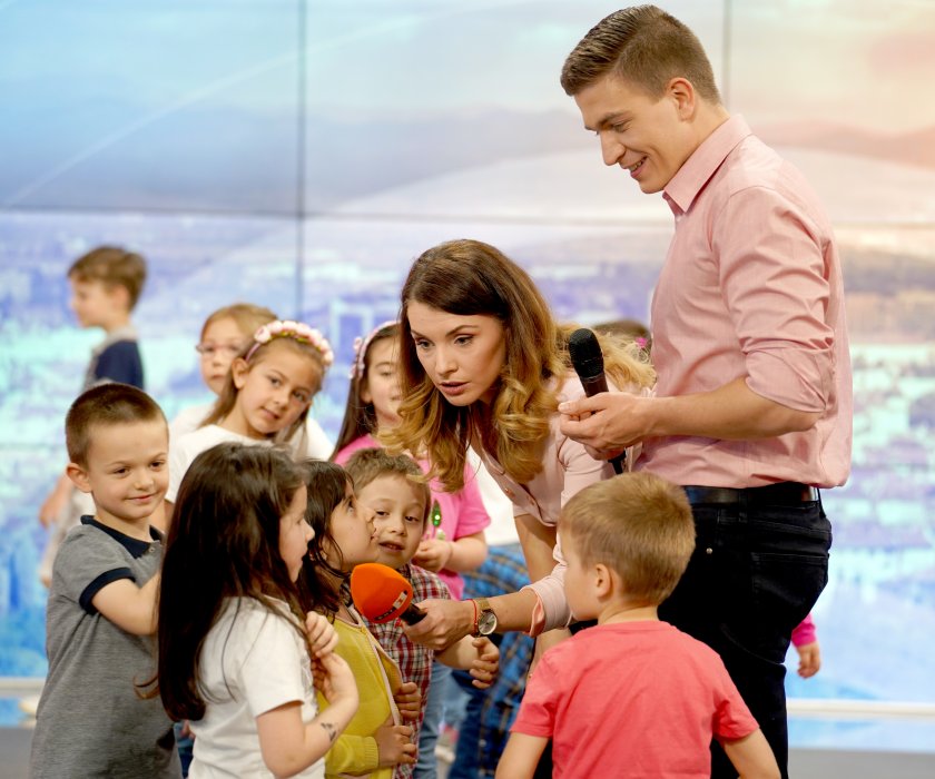 Днес в постройката на Българска национална телевизия гостува група деца от столичната детска градина " Драгалевци ". Те пристигнаха по покана на водещите на утринния блок " Денят стартира " Христина Христова и Симеон Иванов, с цел да се срещнат с магията на малкия екран и да научат нови неща.