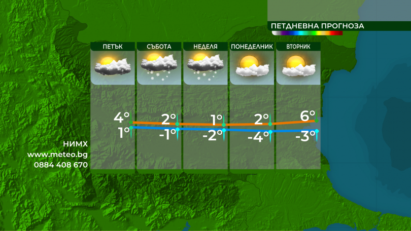 През почивните дни също ще доминира облачно време, само че още веднъж тук-там ще превалява, най-вече слаб сняг. В източната половина от страната в неделя вятърът ще се ориентира от север-североизток и с него ще нахлуе още една порция по-студен въздух. Минималните температури ще паднат тук-там до минус 4°, минус 5°, а оптималните ще са близки до нулата.