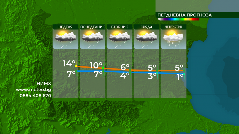 Увеличението на облачността, което ще стартира в края на деня в Западна България, ще продължи, и в неделя се чакат валежи от дъжд, повече в Югозападна България. Ще се задържи по-топло от нормалното, като се изключи регионите с трайни мъгли.