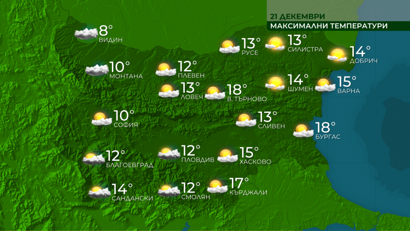 Днес вятърът от югозапад ще се усили, изключително в Източна България и там температурите следобяд ще доближат стойности до 17°-18° градуса, в по-голямата част от страната - от 9° до 14°, в крайните северозападни региони – към 8°.
