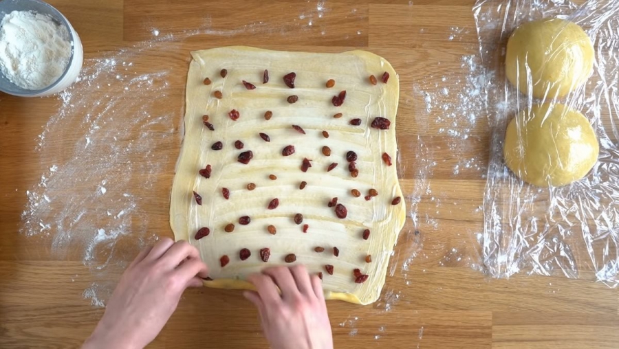 9. След това всяка топка би трябвало да се навие на правоъгълници с височина 2 mm. Тестото би трябвало да е доста фино. Намажете щедро всяка част с меко масло и поръсете със сушени плодове. След това правоъгълният пласт би трябвало да се навие на ролка.
