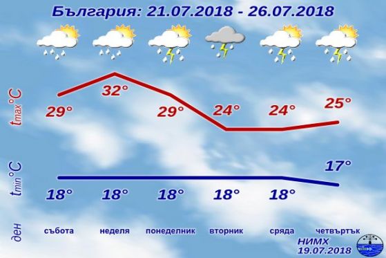 Максимални температури ще са сред 26° и 31°, за София тя ще е към 26°. Над столицата ще е облачно, само че няма да вали, съгласно прогнозата на Националния институт по метеорология и хидрология при Българска академия на науките. Възможно е да превали над София област. Валежи с гръмотевици се чакат над областите Варна, Велико Търново, Шумен, Русе, Силистра, Сливен, Стара Загора и Кърджали.