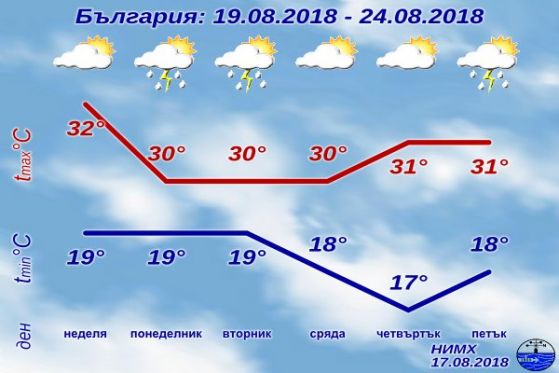В началото на идната седмица към и след обяд ще се развива купеста и купесто-дъждовна облачност и на повече места ще превали и прегърми. Температурите едва ще се намалят. В средата на седмицата ще има повече слънчеви часове, вероятността за превалявания е дребна. В петък още веднъж ще има условия за краткотрайни превалявания с гръмотевици. През множеството дни в западната половина от страната ще духа слаб източен вятър, в източната - до сдържан от изток-североизток.