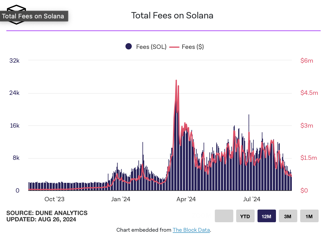 Дневните такси за транзакции в блокчейна на Solana са спаднали до $639,000, което съставлява 65% спад по отношение на пика от $1.83 милиона, доближат на 8 август този месец и 87% спад по отношение на най-високата стойност от $5.08 милиона на 18 март 2024 година, съгласно The Block