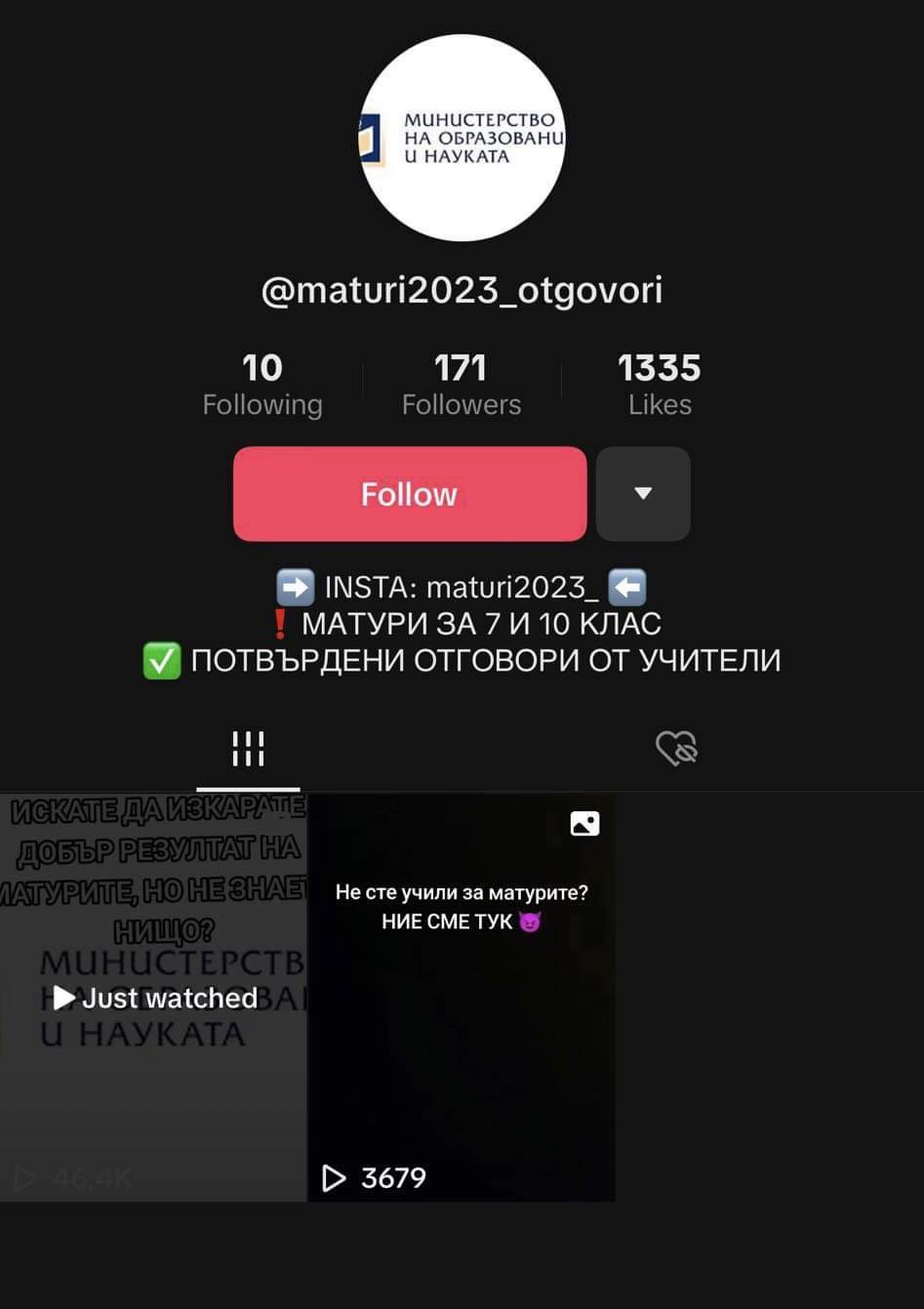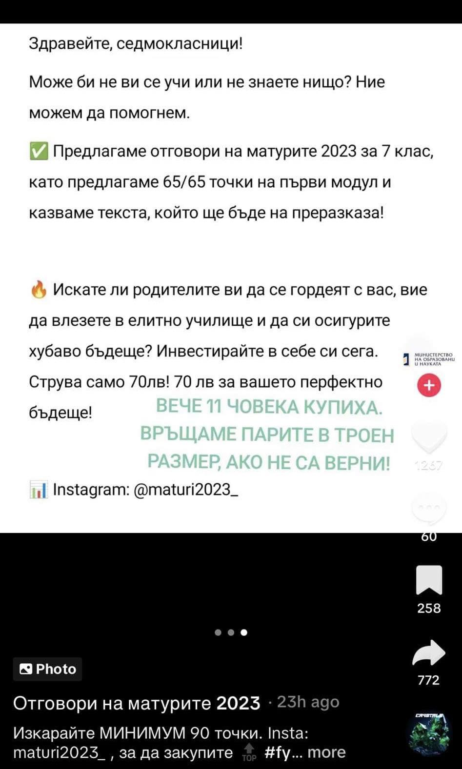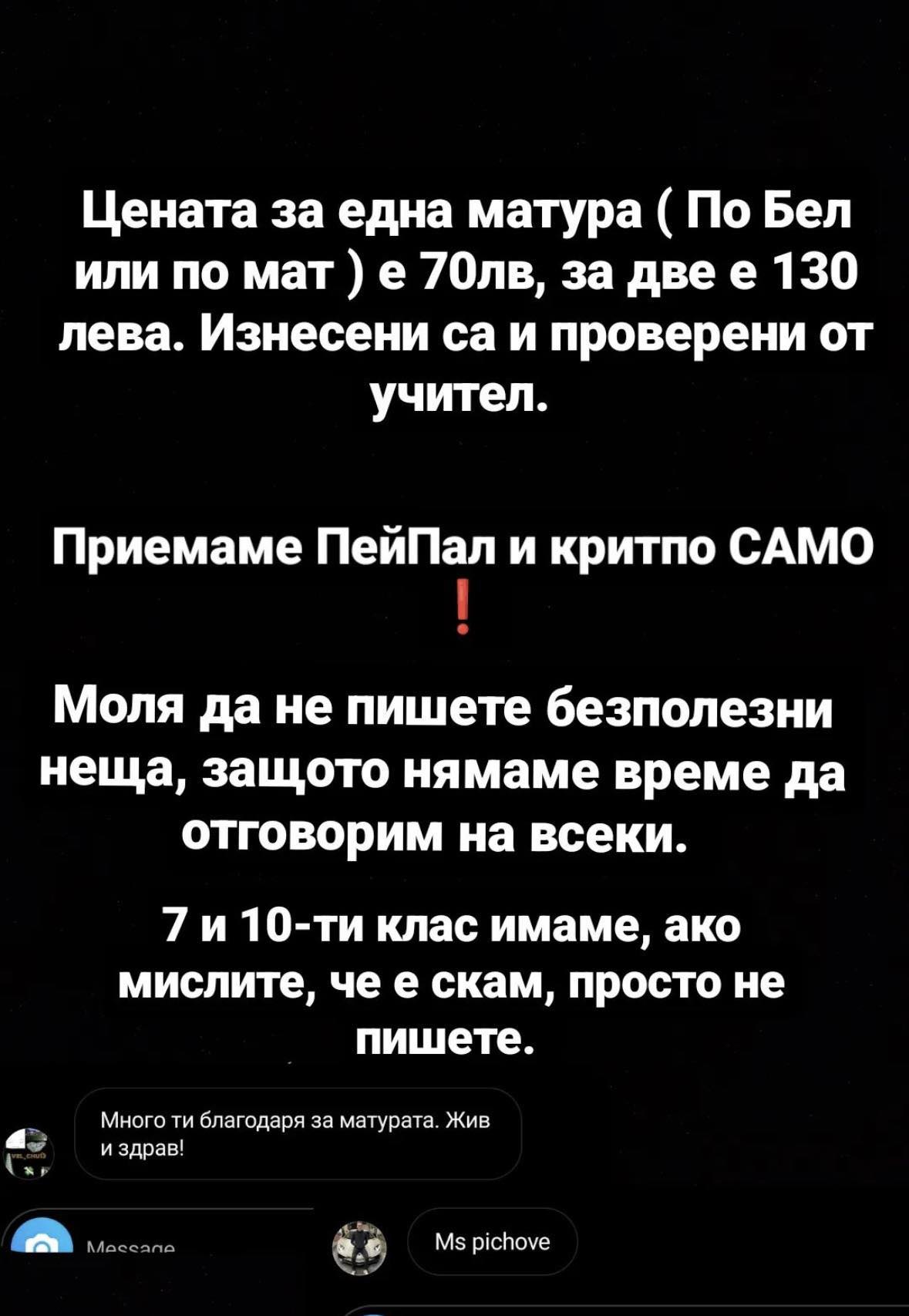 Профилът е качил и разказани цени, а отговори за едната матура ще ви коства скромните 70лв. Ако имате предпочитание за тези по математика цената ще ви бъде общо 130 лв.. Лицето, което поддържа профила ясно е упоменало, че сумите се примат единствено посредством PayPal или заплащане в криптовалута. Интересното е че основателите на профила са се насочили към Тик-ток, с цел да могат да се попуяризират измежду по-млада публика и да подлъжат все някого. Тук описанието е много по-интересно, като се дава обещание съвършено бъдеще в случай че им се довериш. Измамата може да бъде забелязана с просто око, тъй като основателите на акаунта подсигуряват, че в случай че отговорите се укажат неверни парите ви ще бъдат възобновени в троен размер. Как по тъкмо вие сте застраховани в тази обстановка не излиза наяве.