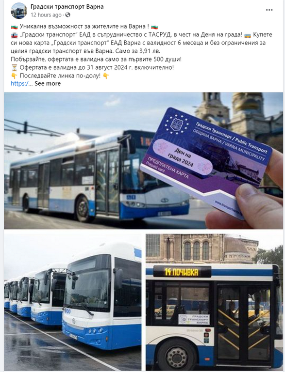 В обществените мрежи се популяризира подправена информация, че „ Градски превоз “ ЕАД Варна в съдействие с Оперативна програма ТАСРУД предлага карти за шест месеца на цена от 3,91лв.