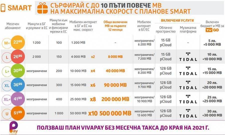 Клиентите на мобилен проект Smart U от VIVACOM получават 10 пъти повече мегабайти или по 500 000 МВ интернет на оптималната скорост за всеки месец през първата година. План Smart XL+ предлага на клиентите 8 пъти повече мегабайти на месец, което прави 200 000 МВ. В Smart XL са включени 6 пъти повече – 90 000 МВ мобилен интернет на месец. Избралите Smart L+ получават 4 пъти повече или 40 000 МВ на месец, а при Smart L мегабайтите на оптималната скорост са удвоени, което прави по 8 000 МВ на месец за първите 12 месеца, вместо по 4 000 МВ.