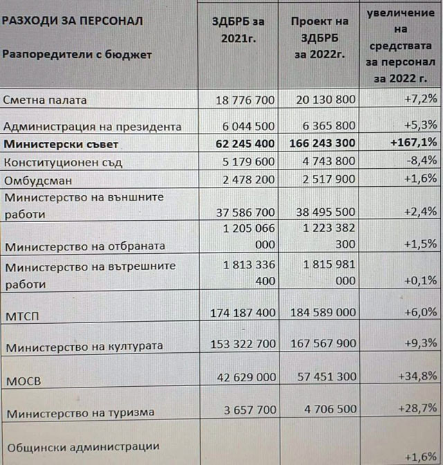 В същото време инспекция в заложеното в бюджета демонстрира забавни числа. Така да вземем за пример разноските за личен състав в Министерския съвет скачат с цели 167% или с близо 103 милиона от миналата година. В екологичното министерство пък ще получат с 34,8% повече. Сериозно ощетени са общините, които получават едвам с 1,6% нарастване.