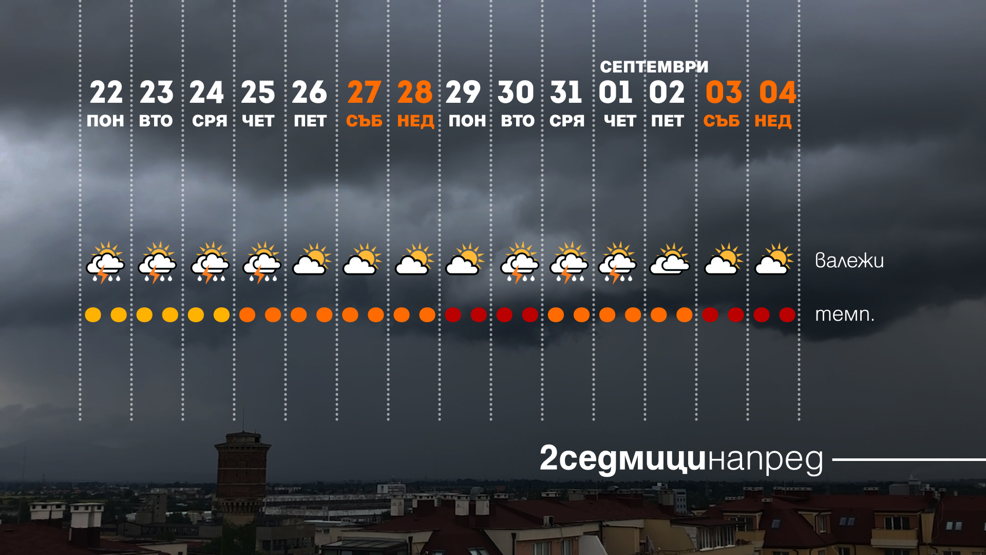 В последните два дни на август се чака прекосяване на леден атмосферен фронт. Нахлуването на по-хладен въздух ще сътвори условия за следобедни летни стихии в Дунавската низина и Западна България. След това обаче предстои парещ интервал, който ще обхване първите дни на септември с минимални разстройства и високи температури – над 35 градуса в обичайно топлите точки на страната.