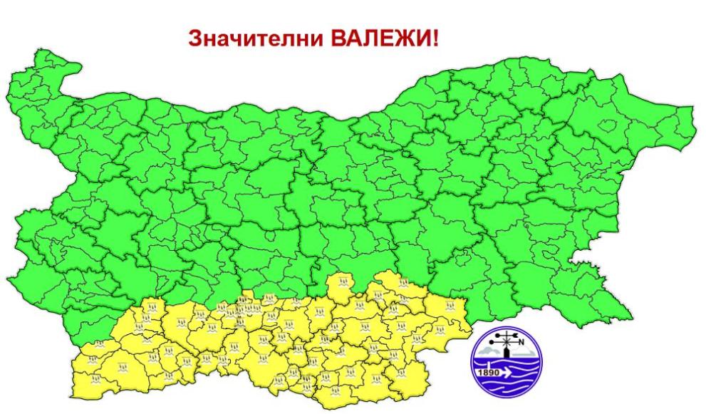 През нощта облачността над множеството региони ще намалее до най-вече ясно, само че в Южна България ще бъде забележителна. Ще духа слаб западен вятър, в Източна България - от север-североизток. Утре (31 юли, четвъртък) от югозапад на изток-североизток ще се развива мощна купесто-дъждовна облачност, ще има краткотрайни превалявания , съпроводени с гръмотевици. Главно в Южна България преваляванията ще са интензивни, обилни по количество и с краткотрайно увеличаване напразно. Има условия и за градушки. Жълт код за евентуално рисково време е разгласен в 7 области на страната - Стара Загора, Хасково, Кърджали, Пловдив, Смолян, Пазарджик и Благоевград.